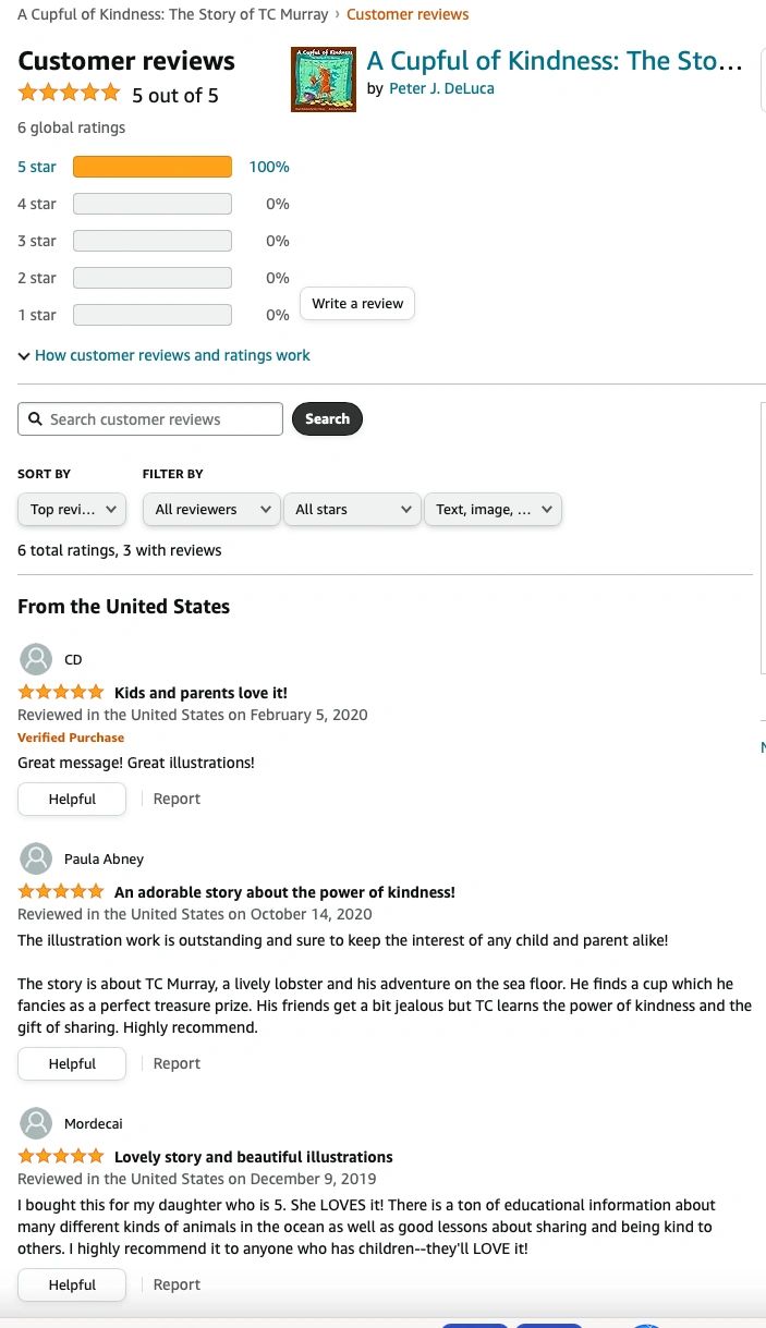 TC Murray is a young lobster that lives in a colorful reef. He takes us on a journey that is filled with compassion as he saves some trapped lobsters and helps other creatures along the way who in return, end up helping him find his way back home. A Cupful of Kindness adventure story has lessons in generosity, sharing, acceptance of others and of oneself and dealing with bullying and respect. This book lends itself to many different parent-child discussions about the above and also provides opportunities to learn about sea life. A Cupful of Kindness is beautifully illustrated by Peter J. DeLuca who has worked in the animation industry for over 30 years with credits on over 20 animated films for some of the major animation studios. He has also designed for several themed parks.